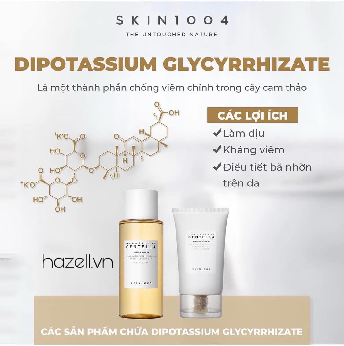 Dipotassium Glycyrrhizate: Thành phần chống viêm chính trong cây cam thảo ngoài việc làm dịu và kháng iêm còn có thể điều tiết các bã nhờn trên da.