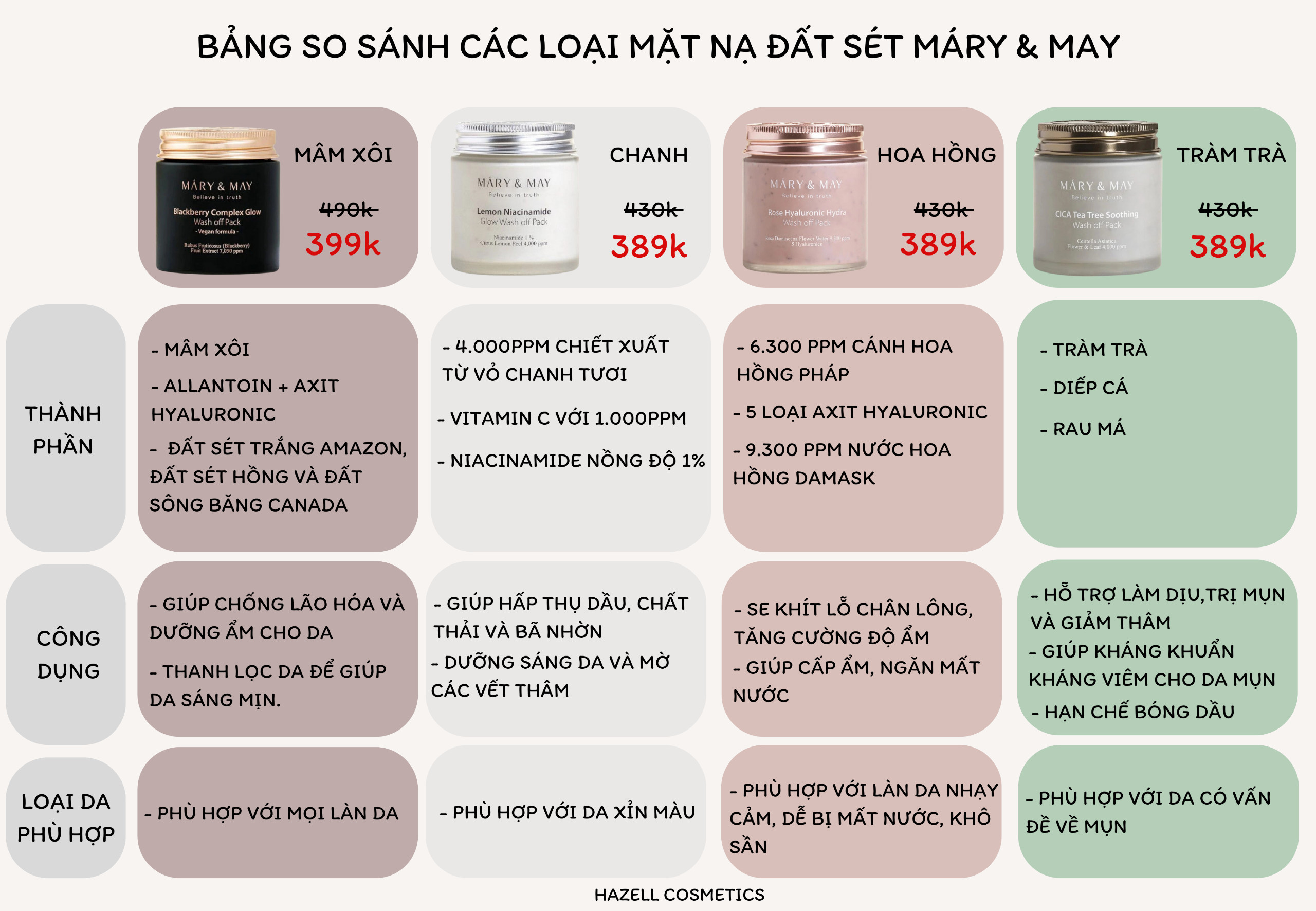 Dưới đây là bảng so sánh thành phần và công dụng mà Hazell đã làm sẵn để các bạn có thể phân biệt dễ hơn nha