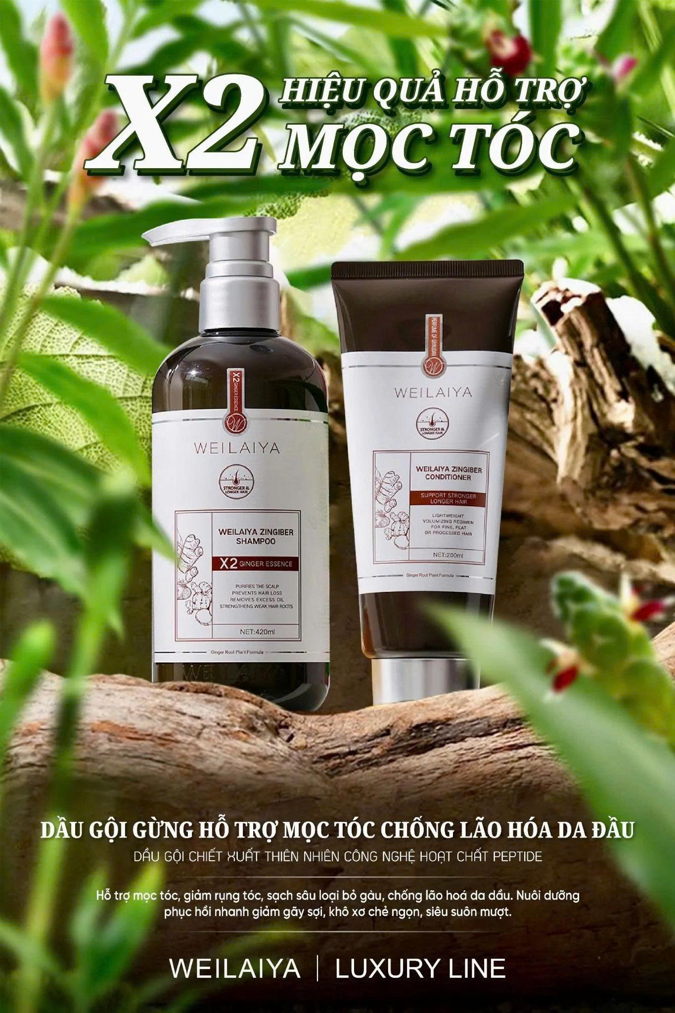 Cặp dầu gội xả gừng hỗ trợ mọc tóc và giảm lão hóa da đầu Weilaiya Luxury gồm: