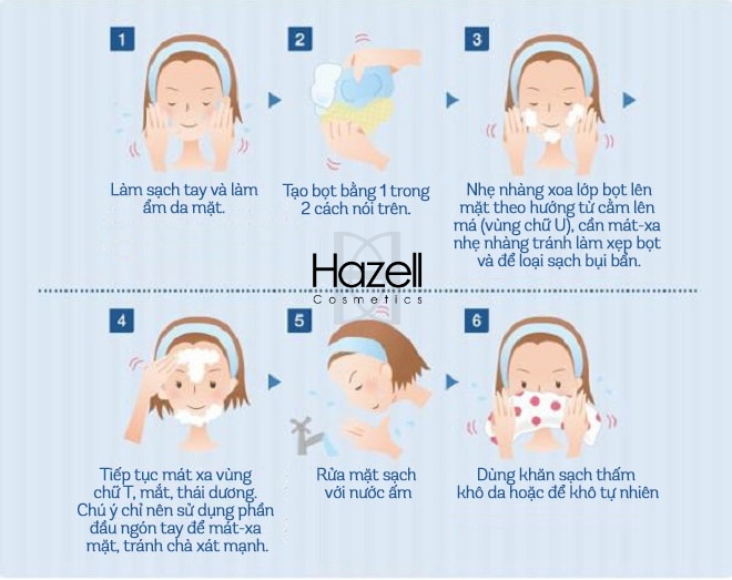 – Rửa mặt lại với nước sạch sau khi tẩy trang xong, tiến hành dùng sữa rửa mặt. Bạn không nên rửa mặt với sữa quá lâu vì sẽ làm mất sạch sẽ lớp dầu tự nhiên trên da mặt. Thời gian rửa mặt tối đa là 2 phút, sau đó bạn đợi khoảng 1 phút cho da dịu lại rồi chuyển tới bước tiếp theo.