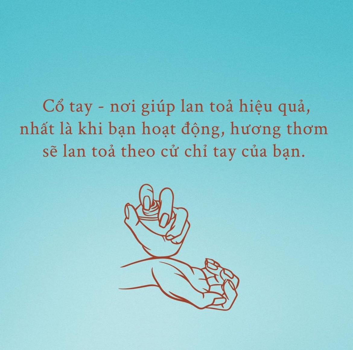 - Cổ tay là nơi giúp lan toả hiệu quả, nhất là khi bạn hoạt động, hương thơm sẽ lan toả theo cử chỉ tay của bạn. Tuy nhiên, tay cũng là nơi thường hay bị rửa trôi nhất, bạn nhớ xịt lại để lưu hương lâu nhé.