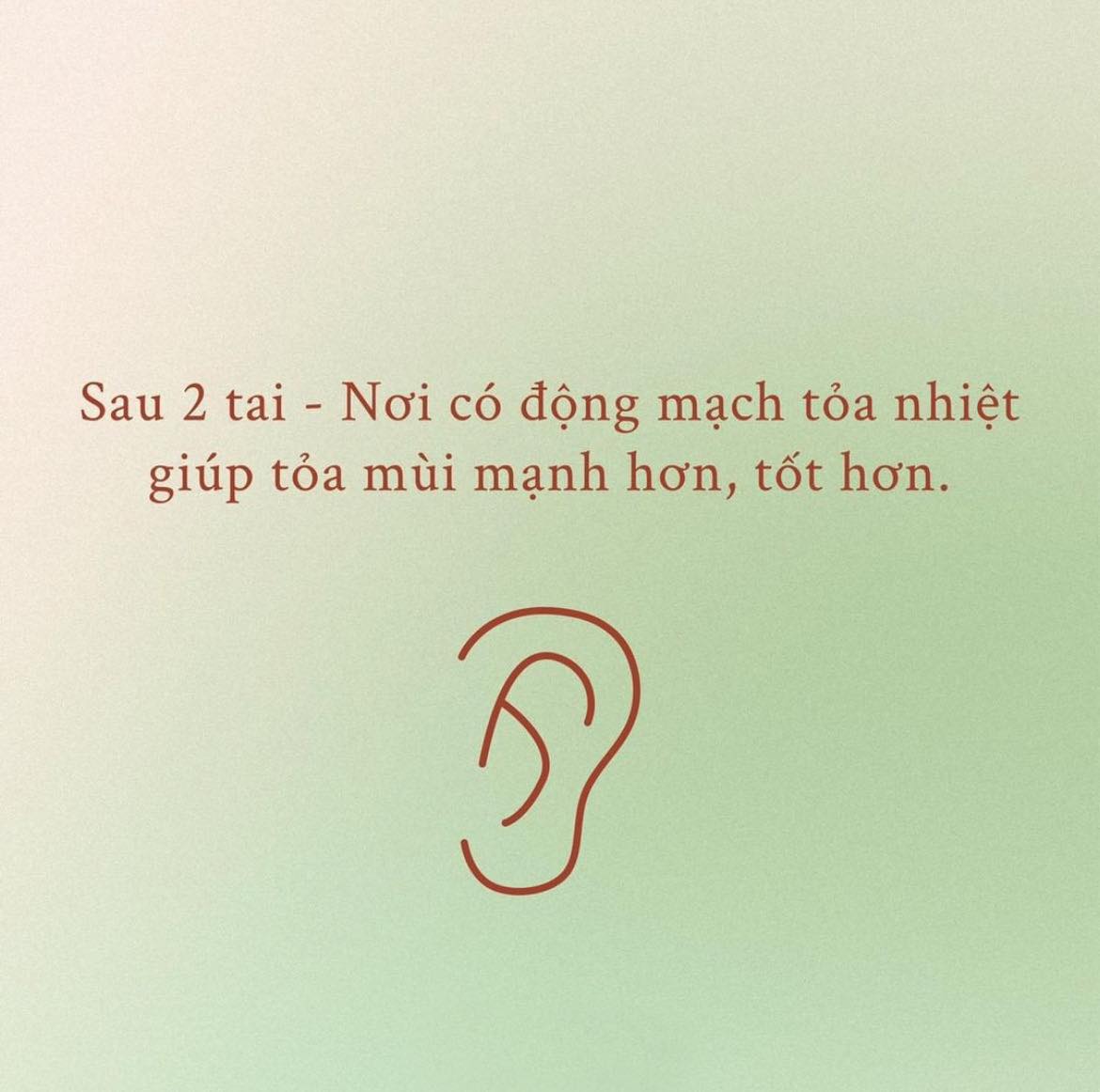 - Sau 2 tai: ở đây có những động mạch liên tục đập và tỏa nhiệt nên điều đó cũng sẽ giúp cho mùi hương, đặc biệt là các mùi tông fresh, mát mẻ và sảng khoái được phát triển và tỏa mùi tốt hơn. Ngoài ra, vị trí này cũng thích hợp khi chúng ta giao tiếp gần với nhau bằng các hình thức như ôm và hôn.