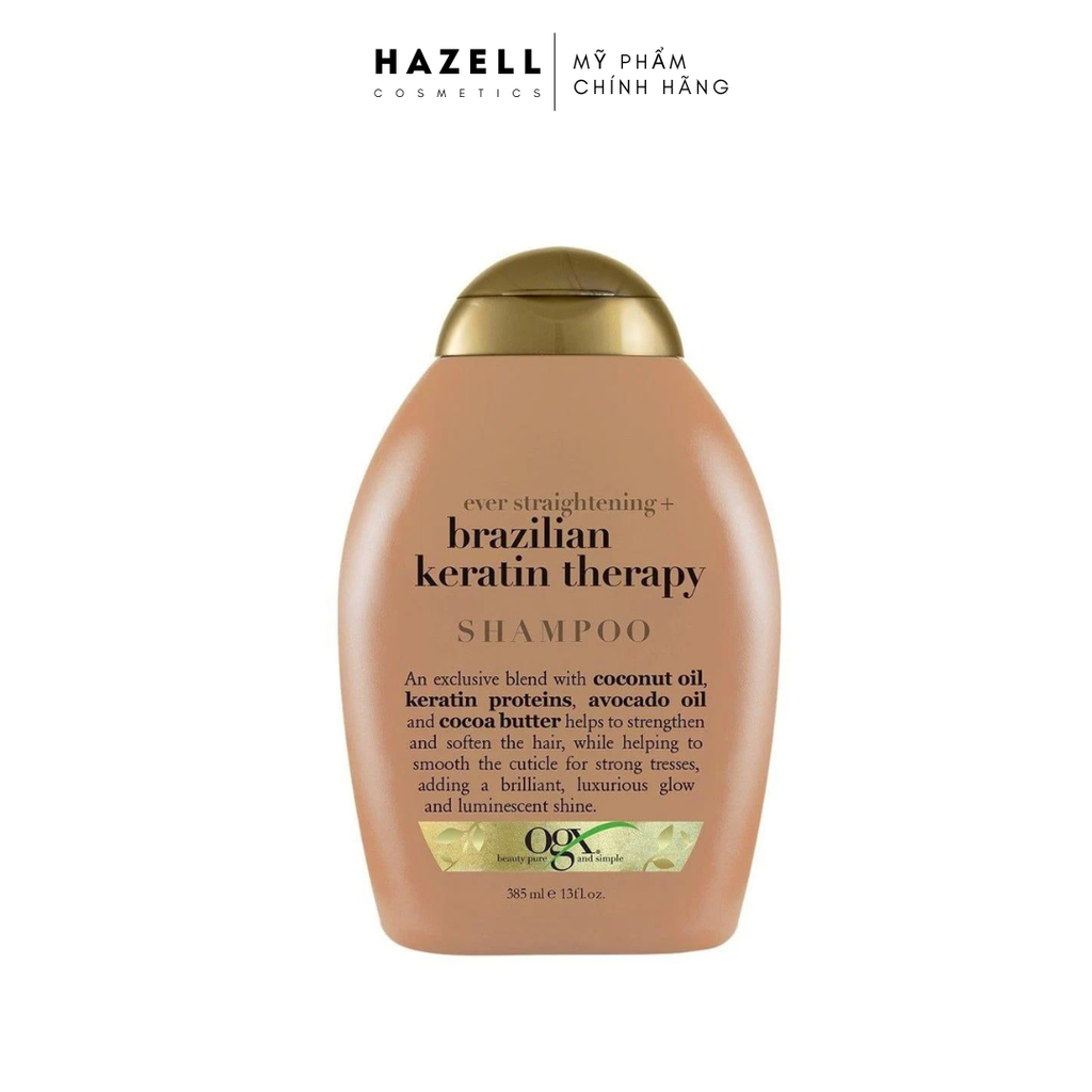 Dầu Gội OGX Ever Straightening + Brazilian Keratin Therapy Shampoo được thiết kế dành cho mái tóc uốn hoặc tóc xoăn tự nhiên, chứa thành phần Protein Keratin, dầu dừa, dầu bơ, bơ cacao... giúp dưỡng ẩm và cung cấp nguồn dưỡng chất tuyệt vời cho mái tóc trở nên vào nếp suôn mượt và chắc khỏe hơn, hỗ trợ bảo vệ tóc khỏi các tác nhân tổn thương, đảm bảo độ hoàn thiện cho cấu trúc tóc, cho mái tóc xoăn hoặc gợn sóng luôn vào nếp và đầy rực rỡ.
