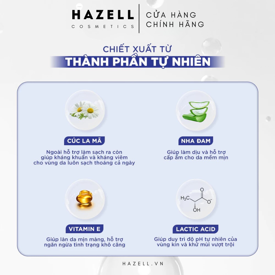 Công thức sản phẩm đã được nghiên cứu chứa các thành phần hoạt tính có trong cơ thể giúp duy trì độ pH tự nhiên của vùng kín. Ngoài ra, thành phần thiên nhiên Vitamin E, Cúc La Mã, Nha Đam có trong sản phẩm sẽ cung cấp các đặc tính bảo vệ và giữ ẩm tuyệt vời cho vùng da ‘nhạy cảm’, mang lại cảm giác tươi mát khi sử dụng.