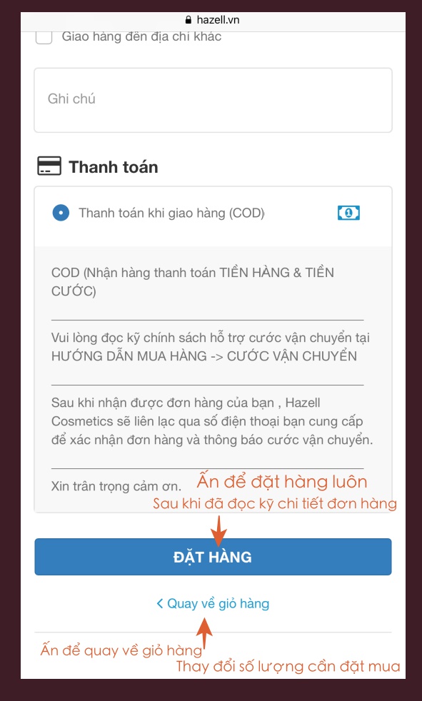 ◼️Bước 5: Xem lại thông tin đặt hàng, điền chú thích và ấn ĐẶT HÀNG