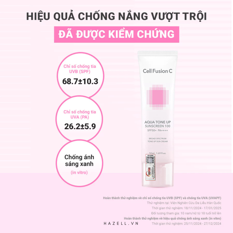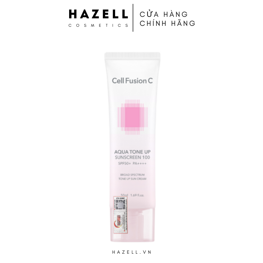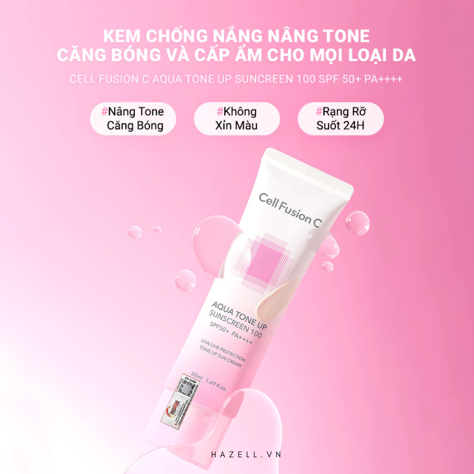 Cell Fusion C Aqua Tone Up Suncreen 100 SPF 50+ PA++++ kem chống nắng nâng tone giúp bảo vệ da trước tác hại của tia UV, đồng thời cấp ẩm dịu nhẹ trên da.