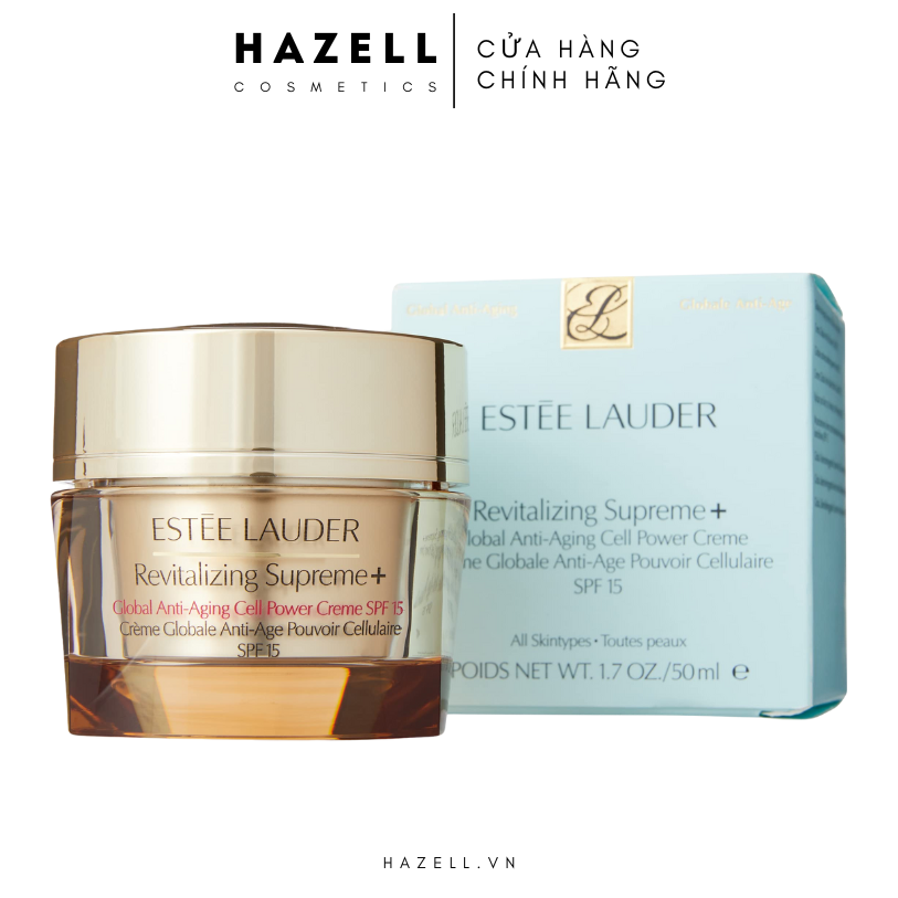 Estee Lauder Revitalizing Supreme+ Global Anti-Aging Cell Power Creme là một loại kem dưỡng ban ngày đa năng mạnh mẽ với chỉ số SPF 15 bảo vệ da khỏi sự lão hóa sớm do tia nắng mặt trời cùng công thức nhẹ nhàng, không chứa dầu và nuôi dưỡng sâu Giúp kích thích sức mạnh tự nhiên của da để tăng cường collagen và elastin. Giảm thiểu đáng kể sự xuất hiện của nếp nhăn . Cải thiện rõ rệt độ săn chắc và đàn hồi của da. Bảo vệ da với kem chống nắng phổ rộng để ngăn ngừa lão hóa da sớm. Da trông mềm mại, mịn màng, đàn hồi, rạng rỡ và trẻ trung hơn. Hoàn hảo cho mọi loại da. Đã được kiểm nghiệm bởi bác sĩ da liễu và không gây mụn.
