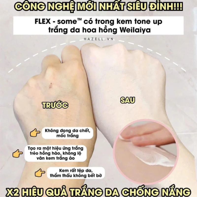 Có hoạt chất làm trắng như Niacinamide, Glutathione, Vitamin C đứng đầu bảng thành phần rồi, lại còn kết hợp công nghệ FLEX SOME TM (hạt kem siêu mềm, gặp nhiệt da là thấm rất nhanh), kết hợp với kem dạng nano phân tử nên hiệu quả dưỡng trắng gấp 6 lần.