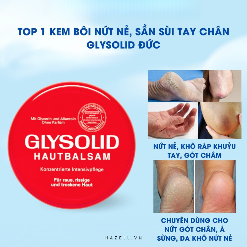 Kem nẻ Glysolid Hautbalsam chống da khô nứt nẻ, da sừng, tróc vảy, nứt gót chân do thời tiết hanh khô mùa hè, cũng như buốt lạnh vào mùa đông.