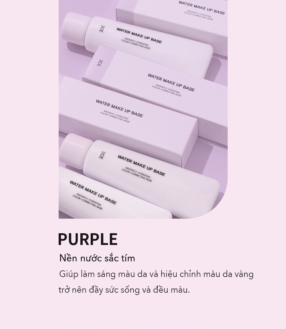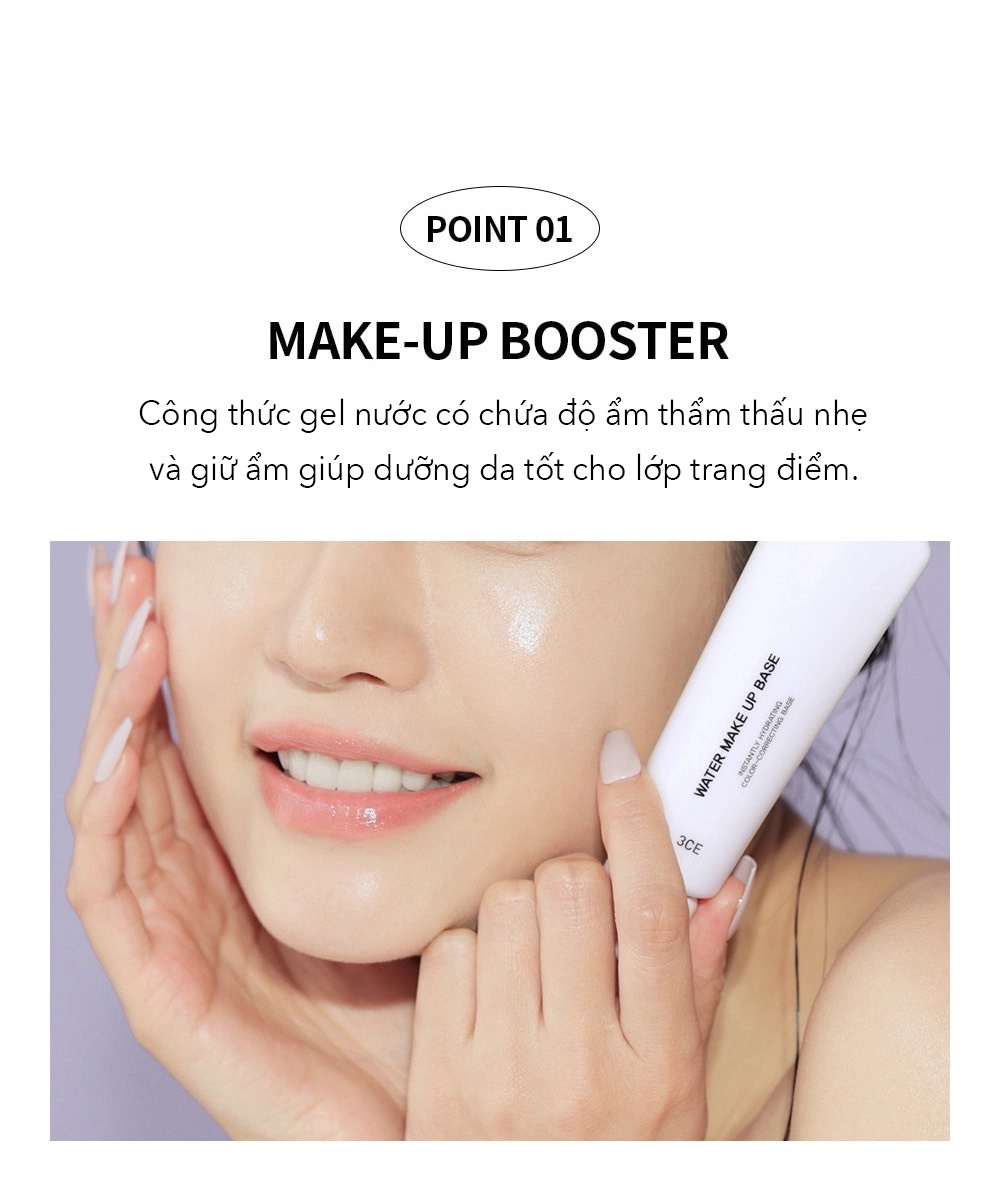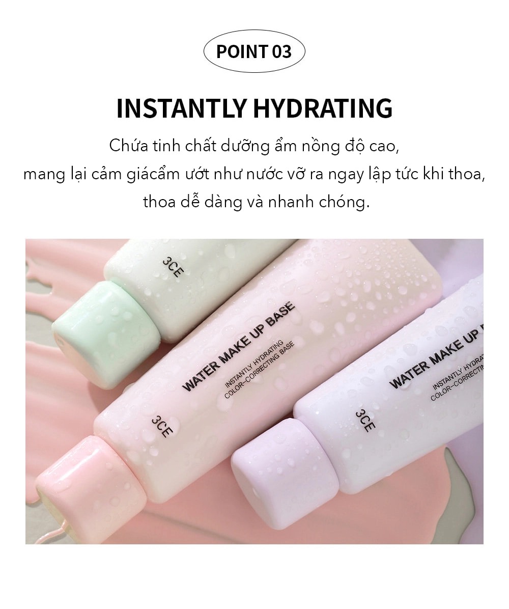 - Kem lót 3CE Water Make Up Base bổ sung độ ẩm cho da trong khi trang điểm giúp lớp nền được duy trì lâu dài, bảo vệ da không bị ảnh hưởng chì từ lớp makeup tiếp sau đó