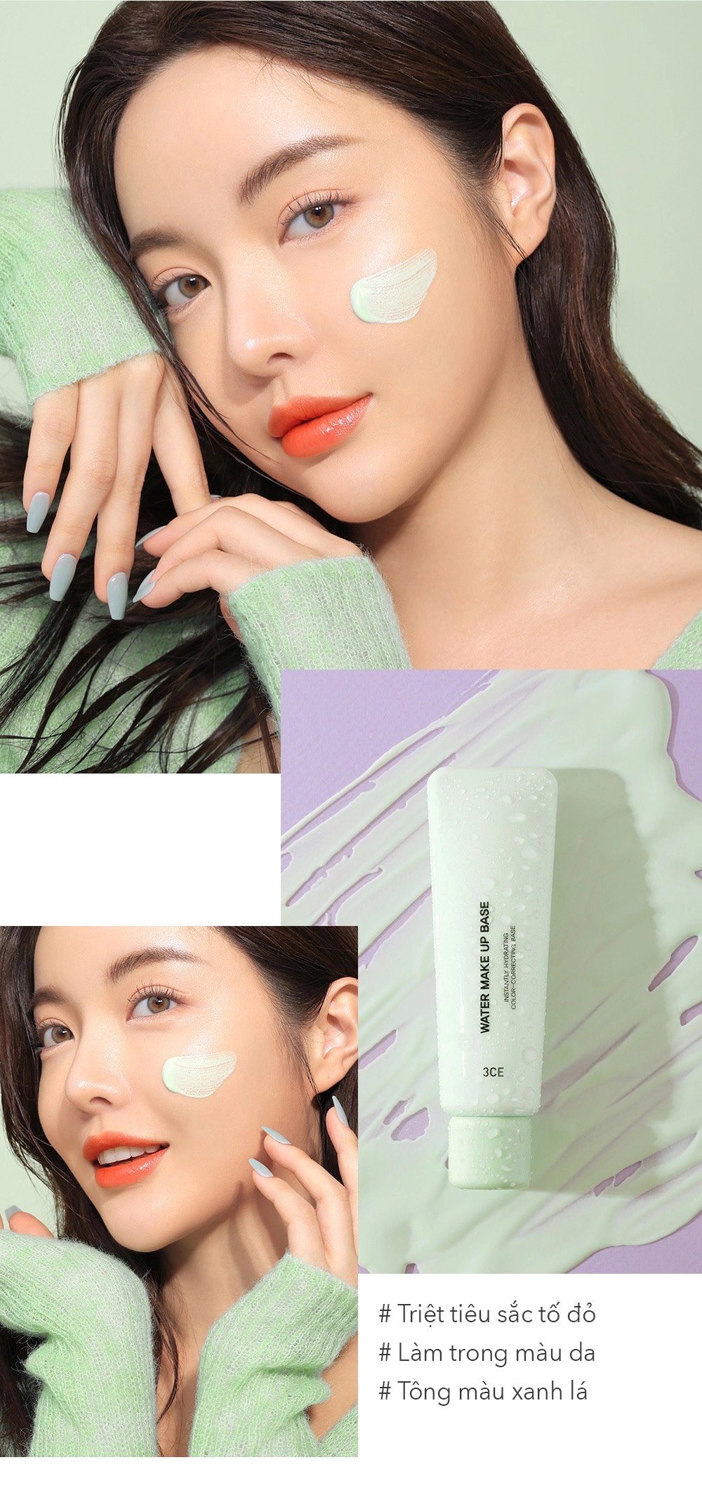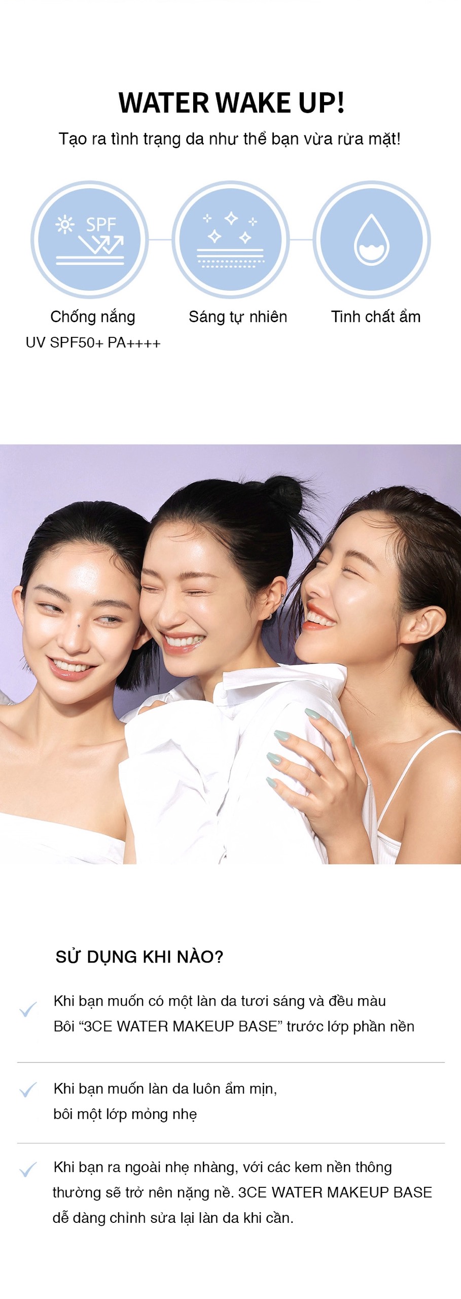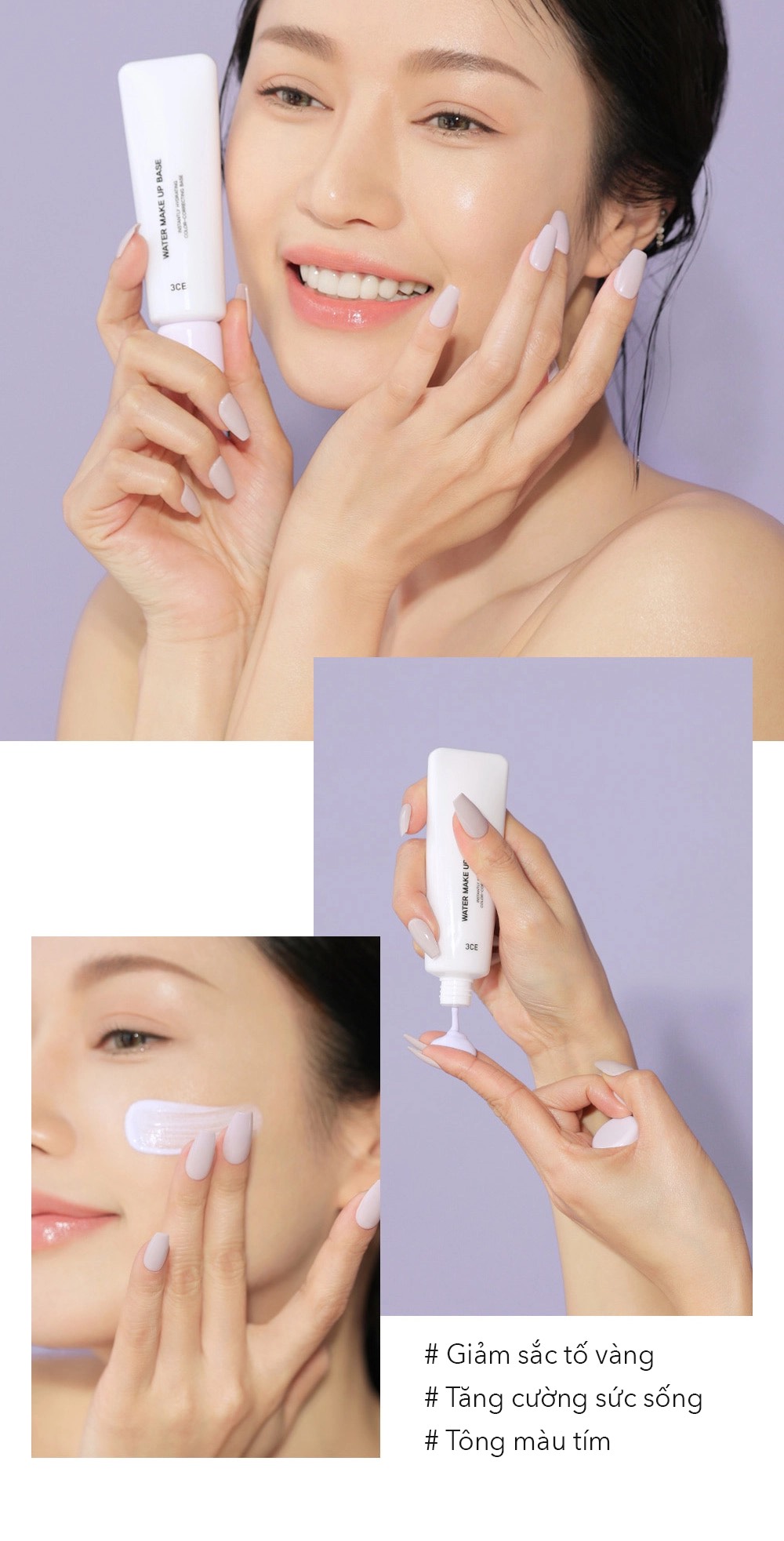 - Kem lót 3CE Water Make Up Base bổ sung độ ẩm cho da trong khi trang điểm giúp lớp nền được duy trì lâu dài, bảo vệ da không bị ảnh hưởng chì từ lớp makeup tiếp sau đó