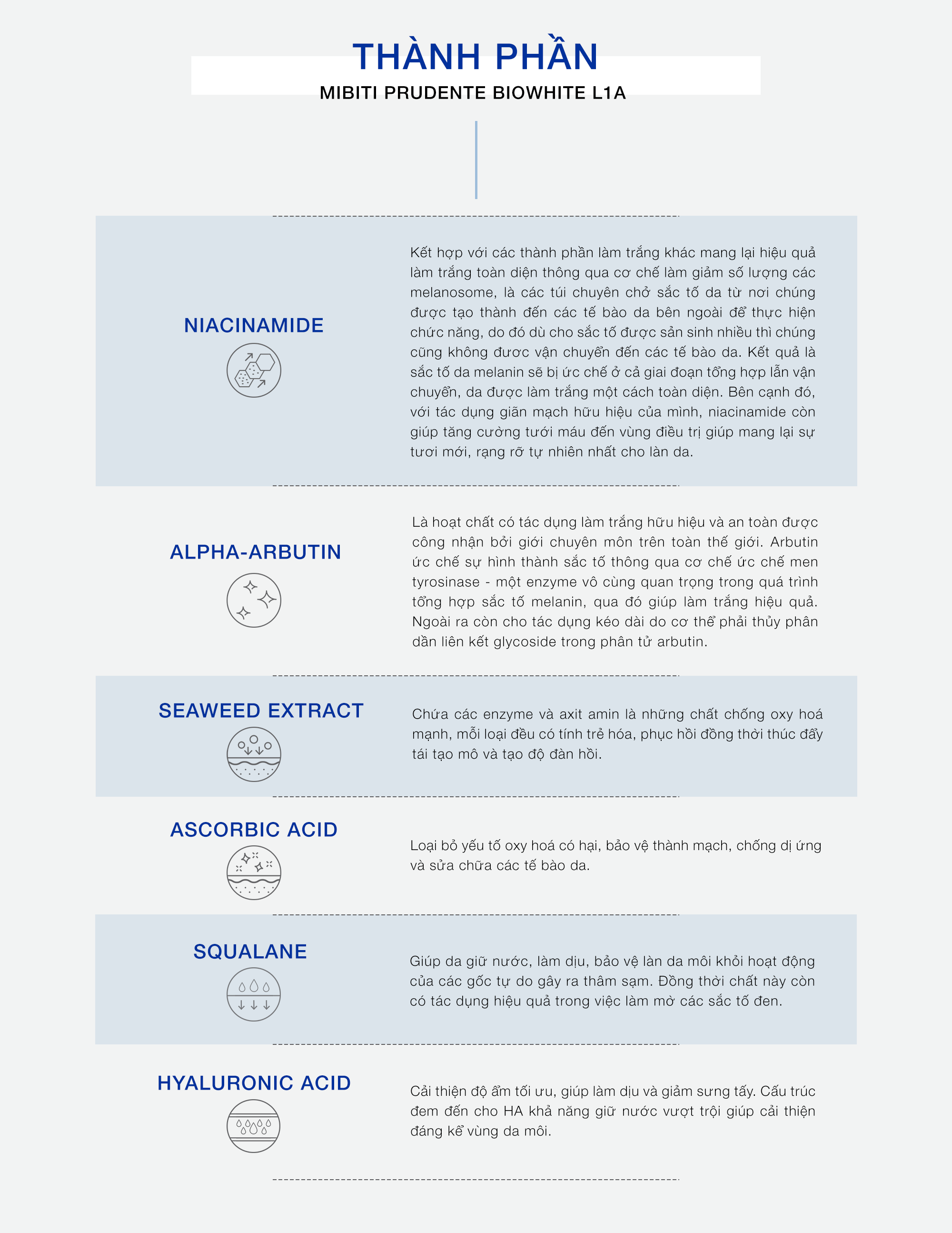 Niacinamide: có khả năng làm giảm các túi melanosome chuyên chở sắc tố da từ nơi sản xuất đến các tế bào da bên ngoài, ngăn chặn sự hình thành melanin ở cả giai đoạn tổng hợp lẫn vận chuyển từ đó thúc đẩy hiệu quả làm trắng da.