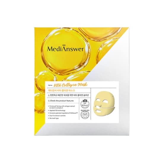 Mặt nạ Filler collagen Medianswer Vita Collagen Mask là dòng mặt nạ có khả năng dưỡng trắng, đồng thời cải thiện nếp nhăn, chống lão hóa. Mặt nạ dạng thạch Medianswer Vita Collagen Mask được ứng dụng công nghệ TDS độc quyền sẽ giúp đưa các thành phần hoạt tính vào tận sâu bên trong da một cách hiệu quả. Bên cạnh đó, sản phẩm còn được ứng dụng Kỹ thuật Cream Coating giúp tăng khả năng giữ ẩm, duy trì độ ẩm hiệu quả. Với thành phần chính chứa 83% chiết xuất Collagen kích thước phân tử 500Da từ Pháp giúp cung cấp độ đàn hồi cho các tế bào da, làm tăng tính săn chắc và đàn hồi của làn da, giúp làm mờ nếp nhăn và giúp da trông trẻ trung hơn. Bên cạnh đó còn giúp cung cấp dưỡng chất và độ ẩm cho da, làm cho da trở nên mềm mịn và tươi sáng, có khả năng thúc đẩy quá trình tái tạo tế bào da, giúp cho da nhanh chóng phục hồi sau các tác động từ môi trường, tia UV và tác nhân khác. Collagen còn có khả năng làm mờ và giảm thiểu sự xuất hiện của các vết thâm, tàn nhang và các dấu vết khác trên da, giúp da trở nên đều màu hơn.