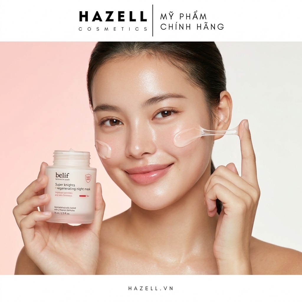 Làm sạch da, cho một lượng mặt nạ ngủ Belif Super Knight Regenerating Night Mask vừa đủ dàn trải đều lên toàn bộ gương mặt.
