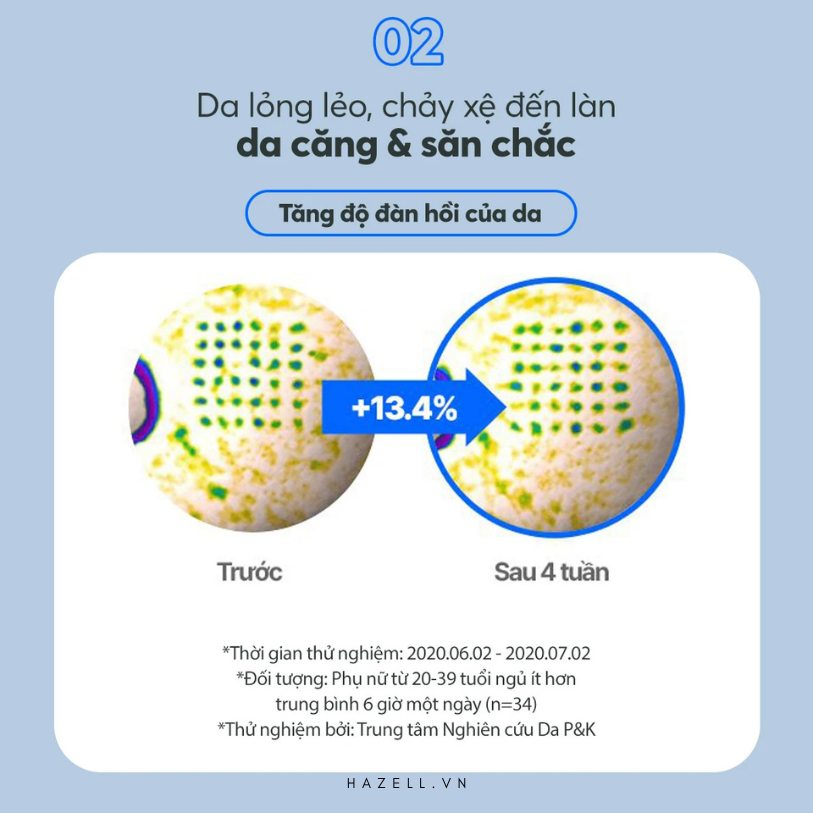 Hàng rào độ ẩm dày đặc (mạng lưới) chứa nhiều thành phần hoạt tính, chẳng hạn như nước khoáng ion hydro, chiết xuất rễ cây anh thảo, chiết xuất mơ Hunza và hơn thế nữa, để da có thể hấp thụ hoàn toàn trong suốt 8 giờ ngủ.