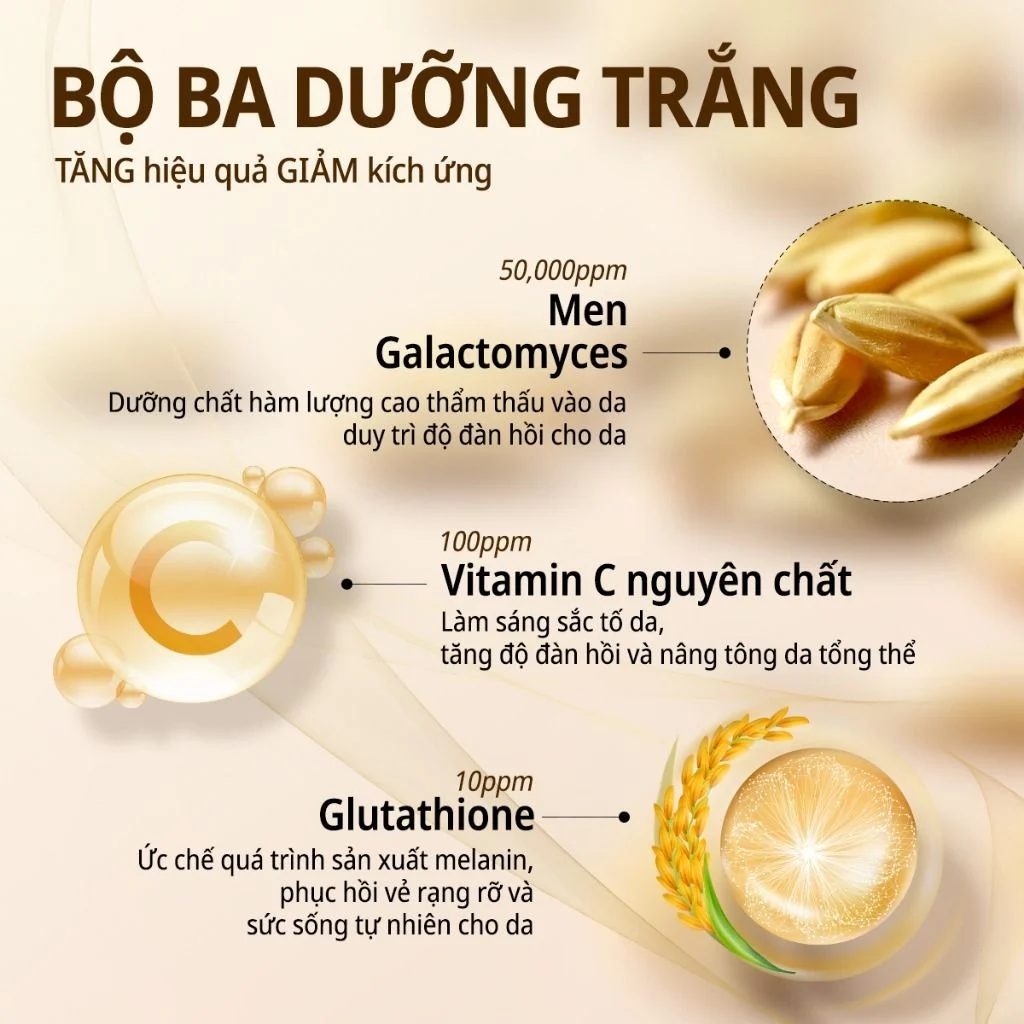 - Dưỡng trắng, giúp làm mờ vết thâm sau mụn, làm mịn kết cấu da và làm sáng màu da thâm sạm. Giúp da sáng lên trông thấy sau vài lần sử dụng.