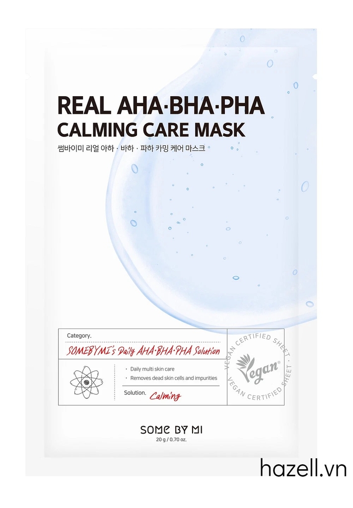 - Mặt Nạ Giấy Some By Mi Real AHA-BHA-PHA Calming Care Mask 20g chứa AHA & BHA giúp loại bỏ các tế bào chết và dầu thừa nằm sâu trong lỗ chân lông, hỗ trợ tái tạo da mới, loại bỏ các nốt thâm mụn và vùng da xỉn màu, ngoài ra còn kháng viêm, kháng khuẩn làm giảm lượng mụn trứng cá và ngăn ngừa tình trạng tích tụ vi khuẩn và cải thiện kết cấu da cho làn da mịn màng và tươi sáng hơn.