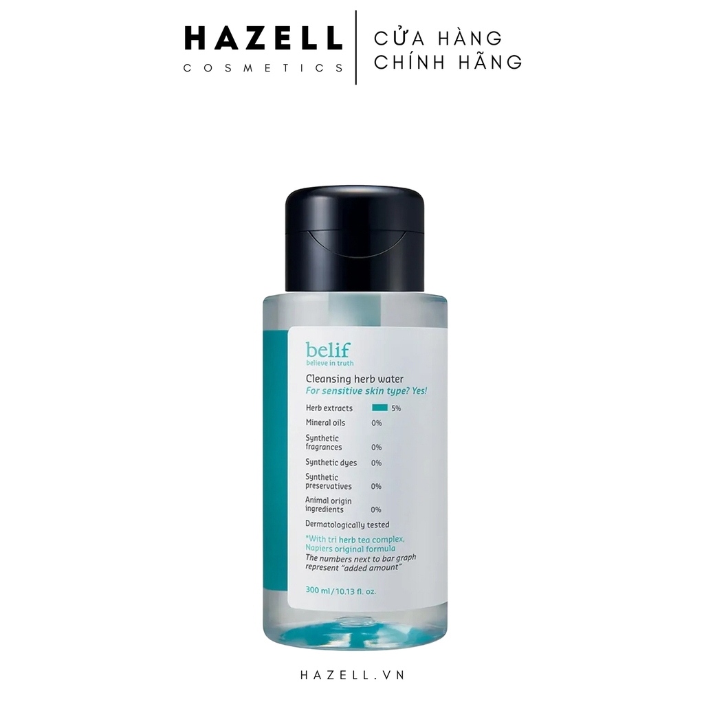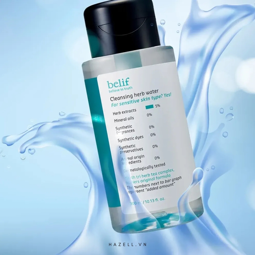 Nước tẩy trang thảo mộc làm sạch sâu BELIF Cleansing Herb Water không chứa thành phần dầu khoáng, giúp loại bỏ sạch lớp trang điểm cứng đầu và bụi bẩn. Không những vậy, sản phẩm còn giúp bổ sung độ ẩm ổn định giúp bề mặt da luôn ẩm mịn, ngừa tình trạng thoát nước và khô căng sau khi tẩy trang.