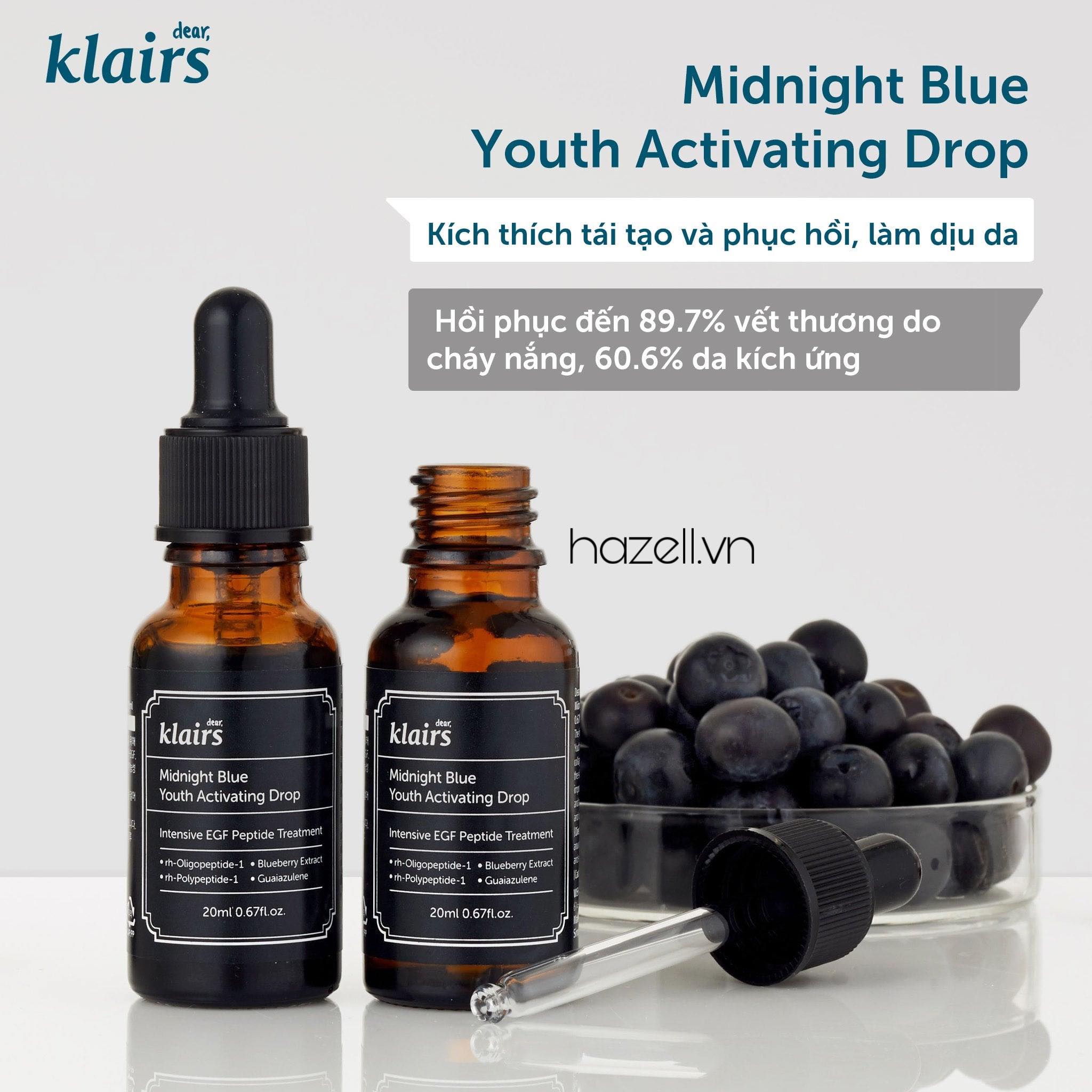 ► Da kích ứng, sưng đỏ: Sự kết hợp của các thành phần chính như EGF, bFGF, chiết xuất hoa cúc, chiết xuất quả việt quất trong Midnight Blue Youth Activating Drop giúp làm dịu da tức thì, kích thích tái tạo và phục hồi da tổn thương.
