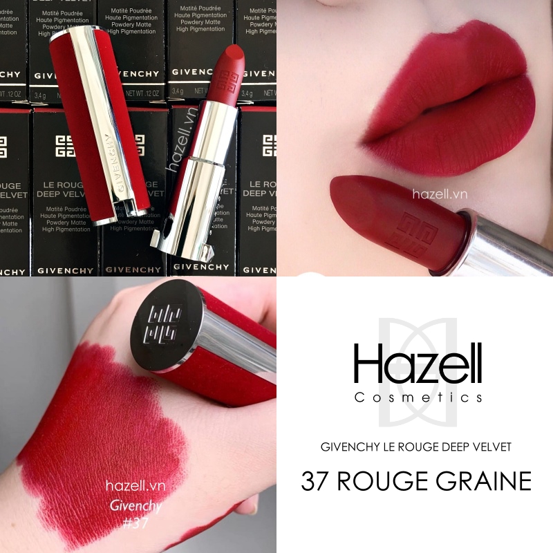 Son Givenchy Le Rouge Deep Velvet màu 37 Rouge Graine là màu mới nhất của Givenchy - mang màu đỏ nhung quyến rũ và tôn da. Trong trường hợp dù là đi tiệc hay nơi công sở. Dù là đang buồn hay đang vui, sắc đỏ ấy luôn luôn làm nền cho thần sắc của bạn, khoe trọn bờ môi mọng rực ánh đỏ. Đầy kiêu hãnh và tự tin.