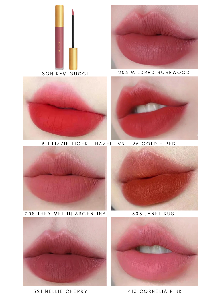 - Chất son Gucci Rouge Liquid Matte 505 Janet Rust lên môi rất căng mọng mướt và mịn màng vô cùng. Một thỏi son kem lì nhưng chứa rất nhiều thành phần dưỡng giúp môi luôn mềm mại mà vẫn giữ độ lì mang đến vẻ đẹp tự nhiên.