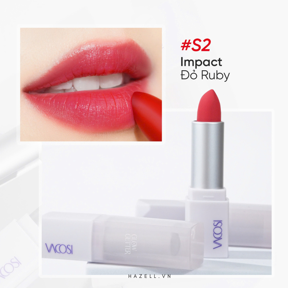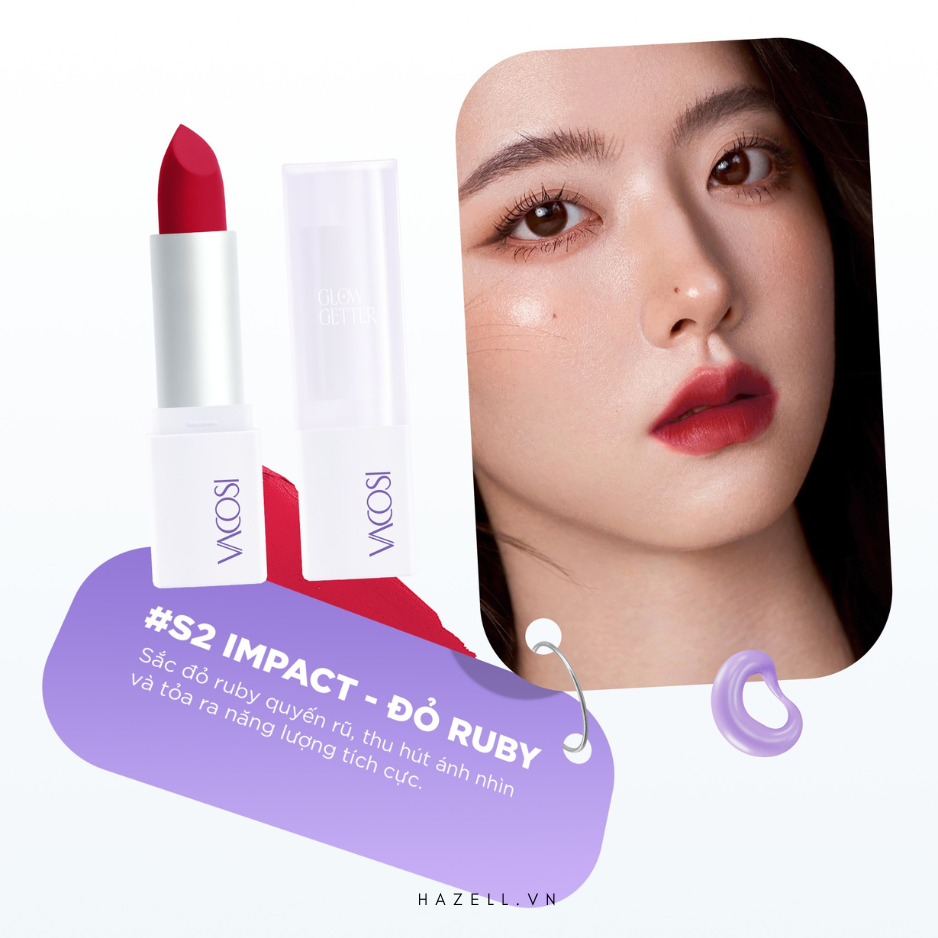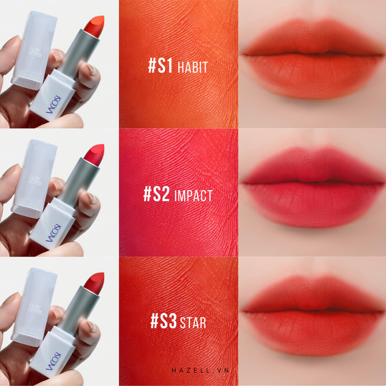 Glow Getter là bộ sưu tập 3 màu son matte mới từ VACOSI với sứ mệnh khẳng định khí chất của người phụ nữ, nhân đôi sự nổi bật để phái đẹp tự tin theo đuổi hoài bão của mình. Cải tiến mới từ kết cấu chất son mềm mịn hơn, cho đến màu sắc thời thượng, tất cả kết hợp lại tạo nên phong thái lôi cuốn và quyền lực.