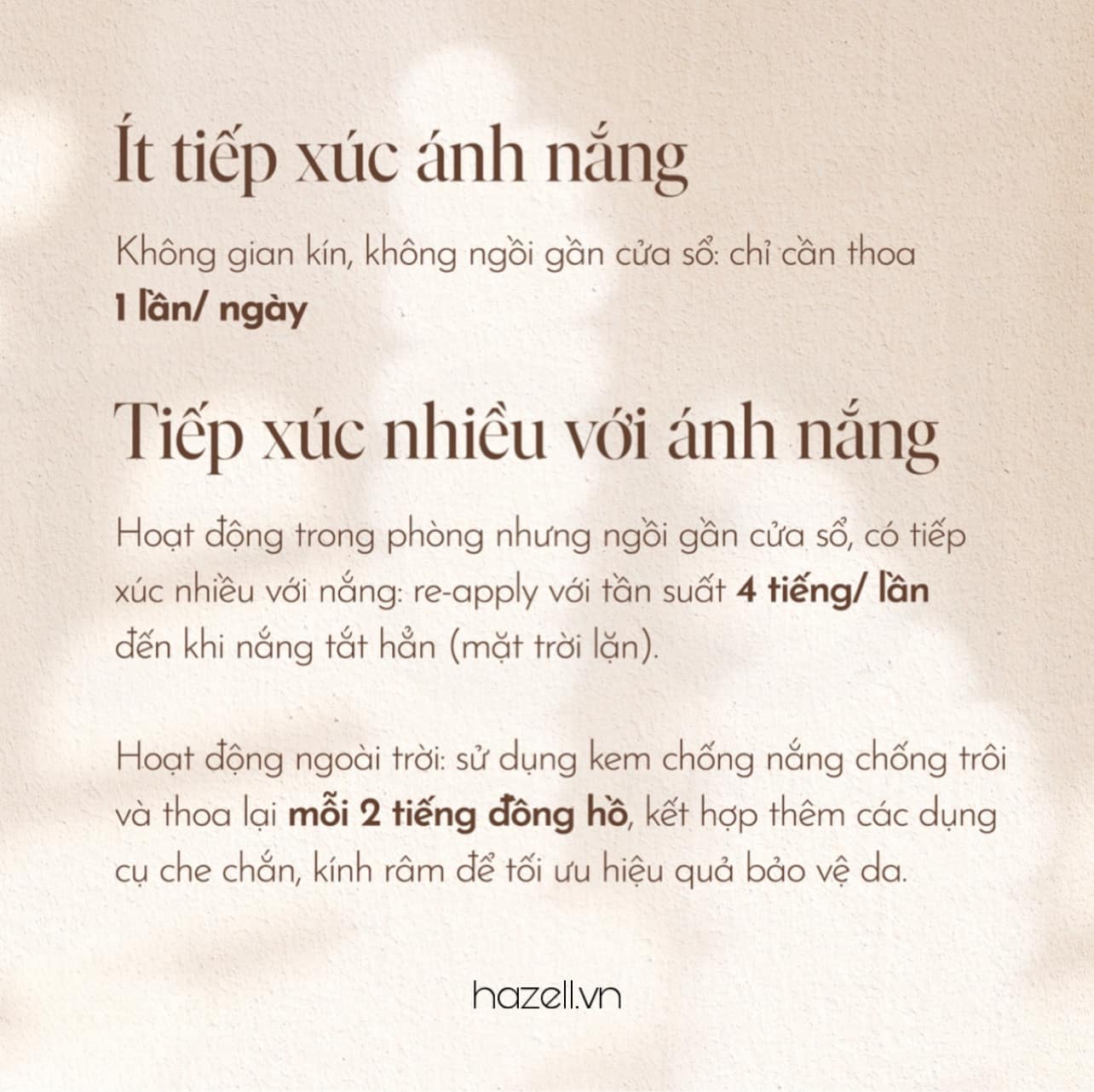 Hoạt động trong phòng nhưng ngồi gần cửa sổ, có tiếp xúc nhiều với nắng: re-apply với tần suất 4 tiếng/ lần đến khi nắng tắt hẳn (mặt trời lặn).