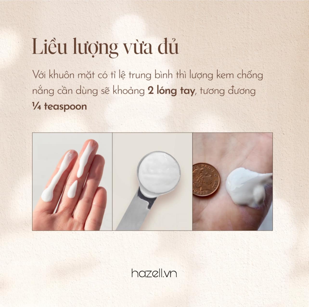Liều lượng vừa đủ: với khuôn mặt có tỉ lệ trung bình thì lượng kem chống nắng cần dùng sẽ khoảng 2 lóng tay, tương đương ¼ teaspoon.