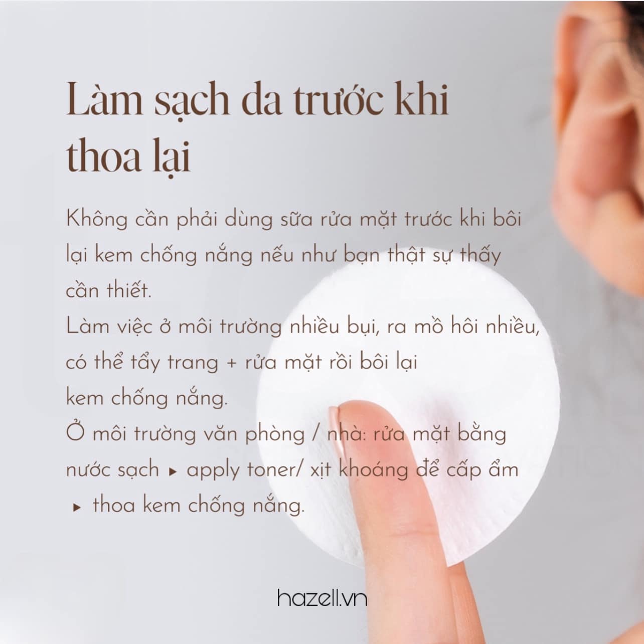 Thoa kem chống nắng luôn là một bước không thể thiếu trong quy trình chăm da. Tuy nhiên sử dụng với liều lượng và tần suất re-apply như thế nào là hiệu quả vẫn còn là vấn đề được quan tâm. Mỗi cá nhân sẽ có tình trạng da riêng biệt cũng như môi trường hoạt động, làm việc khác nhau. Cùng Hazell tham khảo một số tips cần lưu ý trong việc sử dụng kem chống nắng và áp dụng thật linh hoạt nhé ![]()