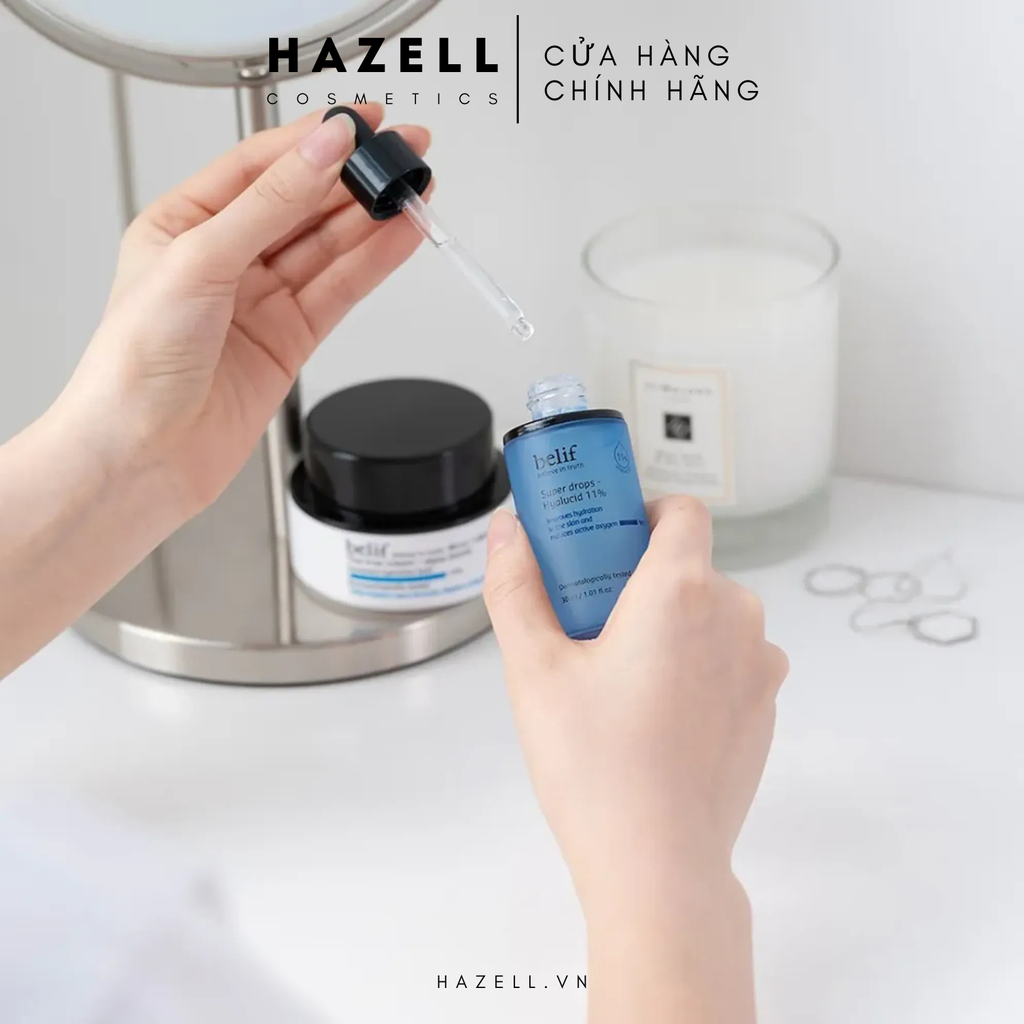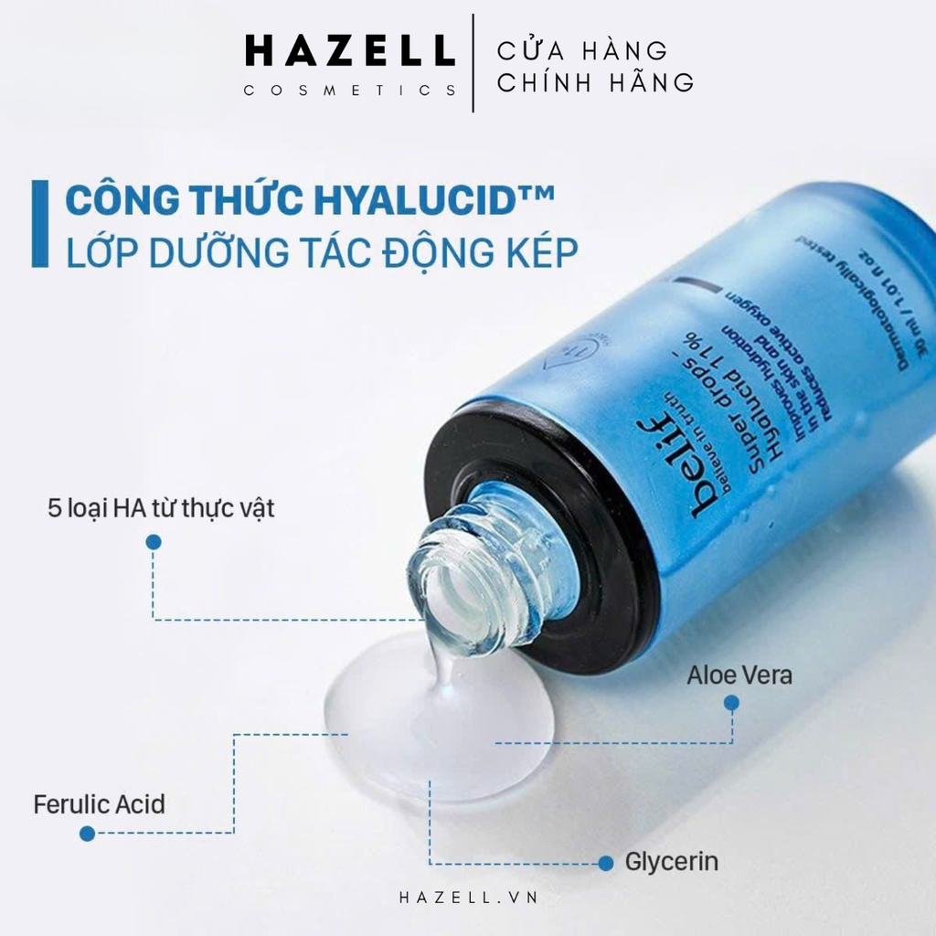 Thành phần hyaluronic acid tinh khiết, đậm đặc nổi bật với khả năng cấp khóa ẩm mạnh mẽ, dồi dào ở các tầng biểu bì da, nhằm khôi phục hàng rào bảo vệ da đồng thời nuôi dưỡng làn da mượt mà, săn chắc hơn. Công thức dưỡng ẩm chuyên sâu từ Belif Super Drops Hyalucid 11% sẽ cải thiện làn da khô căng của bạn, giúp da ngậm nước và tăng cường độ đàn hồi, tăng cường khả năng làm chậm sự oxy hóa. Từ đó, làn da được chăm sóc về độ ẩm một cách mạnh mẽ, duy trì diện mạo da săn chắc, ẩm mượt.