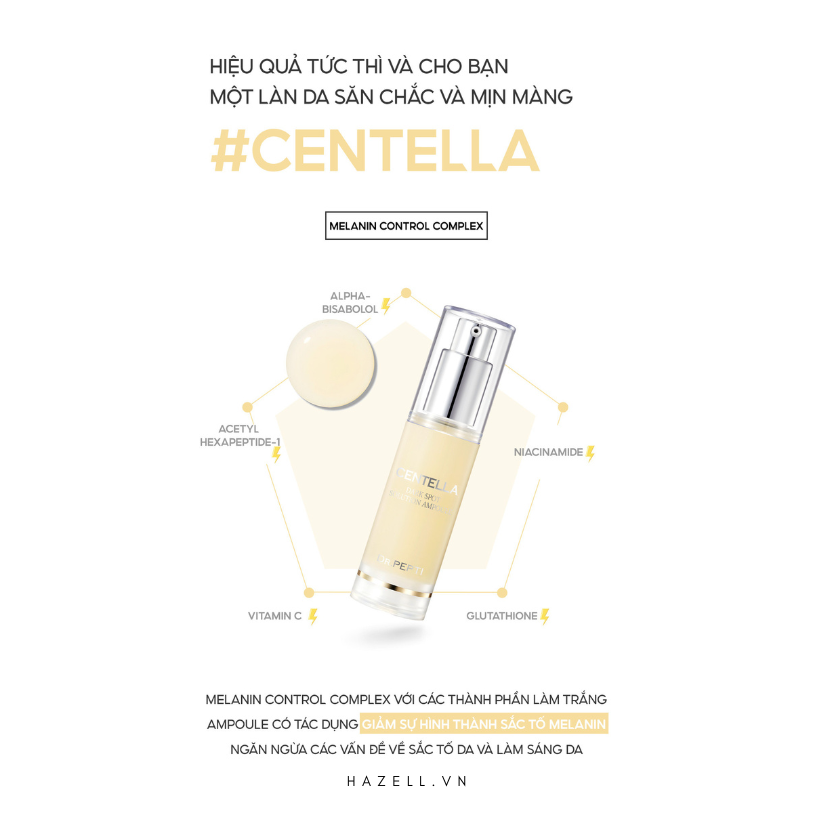 - Tinh Chất Dưỡng Da Dr.Pepti Centella Dark Spot Solution Ampoule với chiết xuất Centella asiatica 50,568%, Peptide, Moist 24, Niacinamide có khả năng cung cấp các thành phần hoạt tính để dưỡng trắng da, tăng đàn hồi và giữ ẩm mà không lo bị kích ứng.