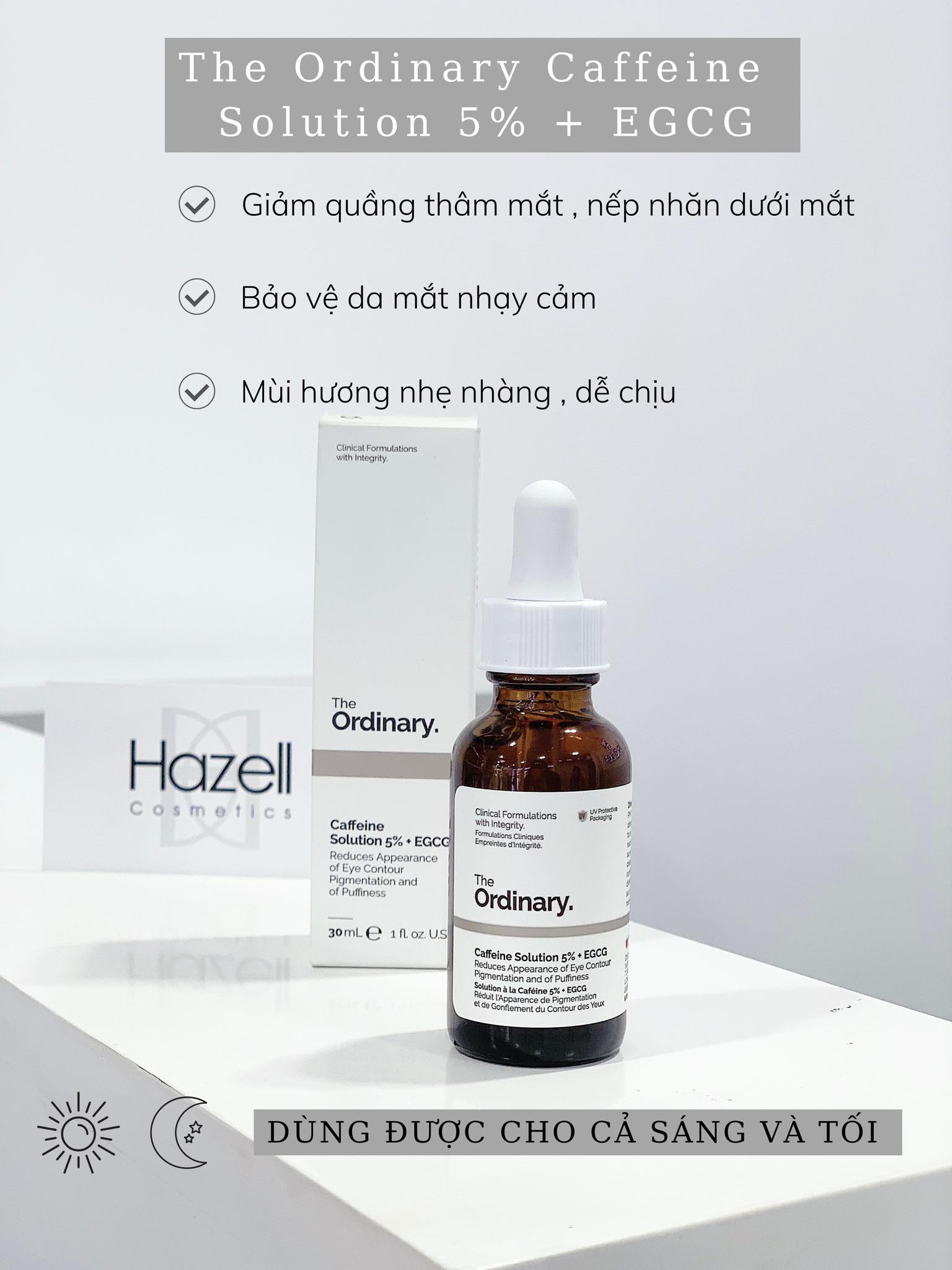 - Caffeine 5%: là chất chống oxy hóa, thu nhỏ các mạch máu giãn ở cùng da quanh mắt, từ đó quầng thâm cũng sẽ mờ đi. Ngoài ra Caffeine còn là chất khử nước của tế bào mỡ trong bọng mắt, giúp làm giảm nhăn mắt, xẹp bọng mắt và ngăn tình trạng chảy xệ da mắt.