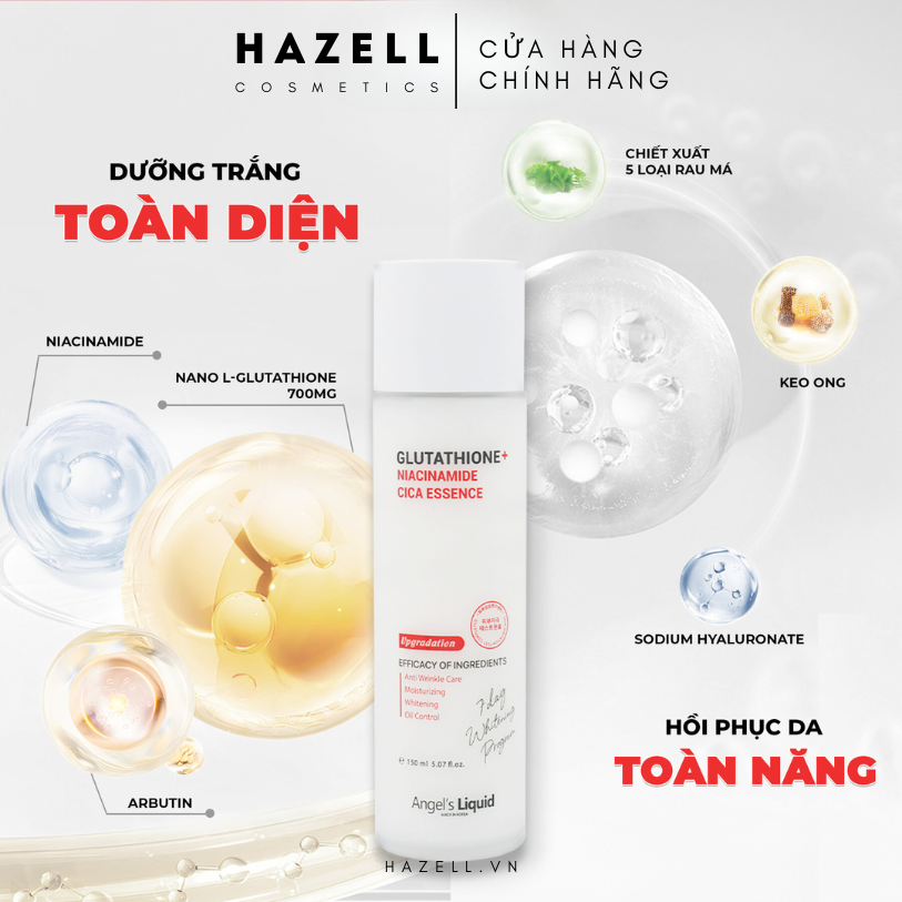 - Angel's Liquid Glutathione + Niacinamide Cica Essence đến từ xứ sở Kim Chi sẽ là vị cứu tinh cho làn da của bạn. Với chiết xuất từ thành phần thiên nhiên lành tính cùng với hợp chất Glutathione và Niacinamide và Cam Thảo có khả năng làm bật tone da chỉ sau 7 ngày sử dụng, phục hồi làn da xỉn màu, giúp da trắng sáng mịn màng, đồng thời còn giúp ngăn ngừa sự xuất hiện của nám tàn nhang và các dấu hiệu gây lão hóa da.