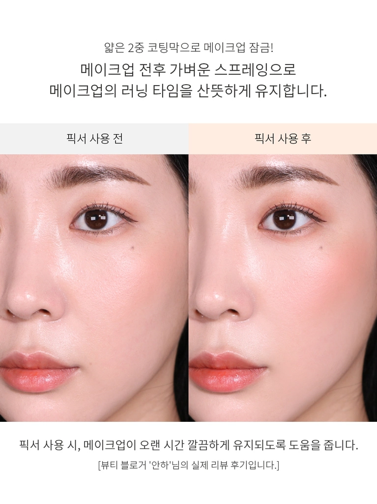 - Làm mờ lớp phấn và làm tươi lớp trang điểm: Xịt khóa lớp trang điểm giúp làm mờ các đường viền, làm tươi lớp trang điểm và giúp nó hòa quyện với da một cách tự nhiên hơn.